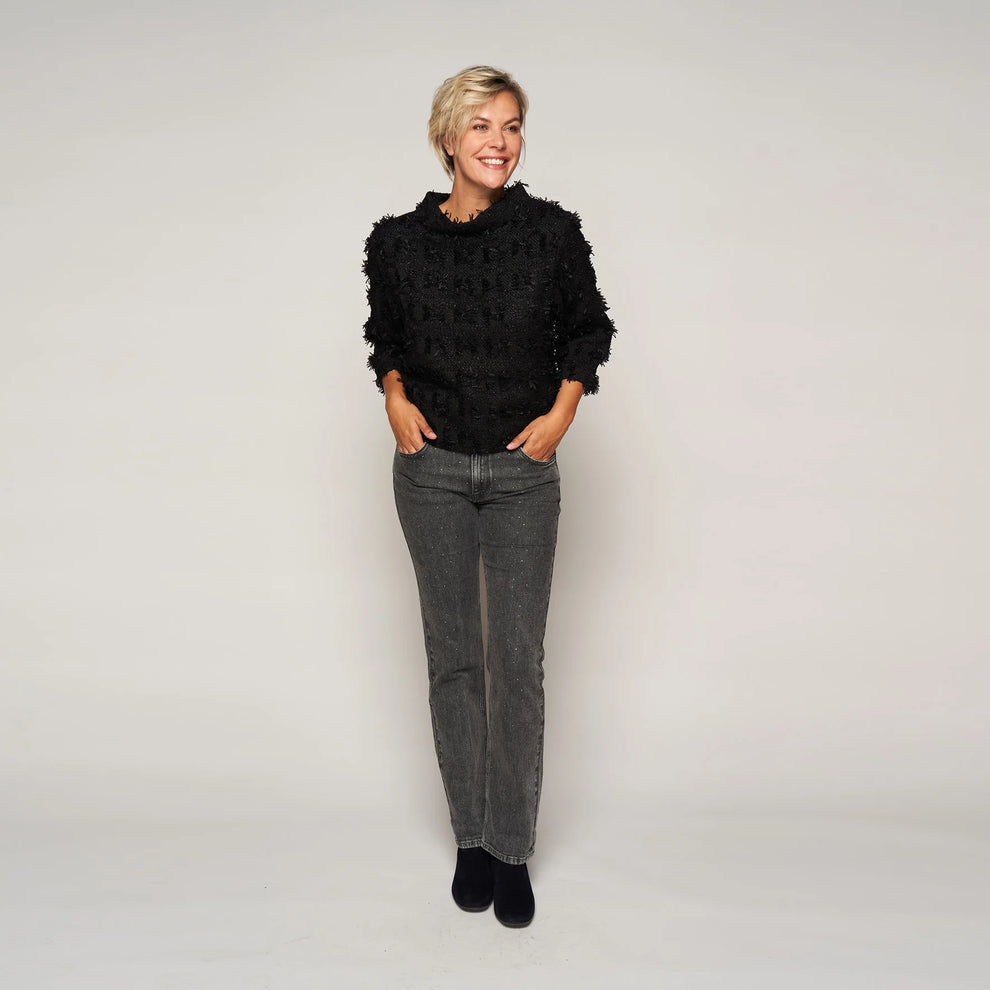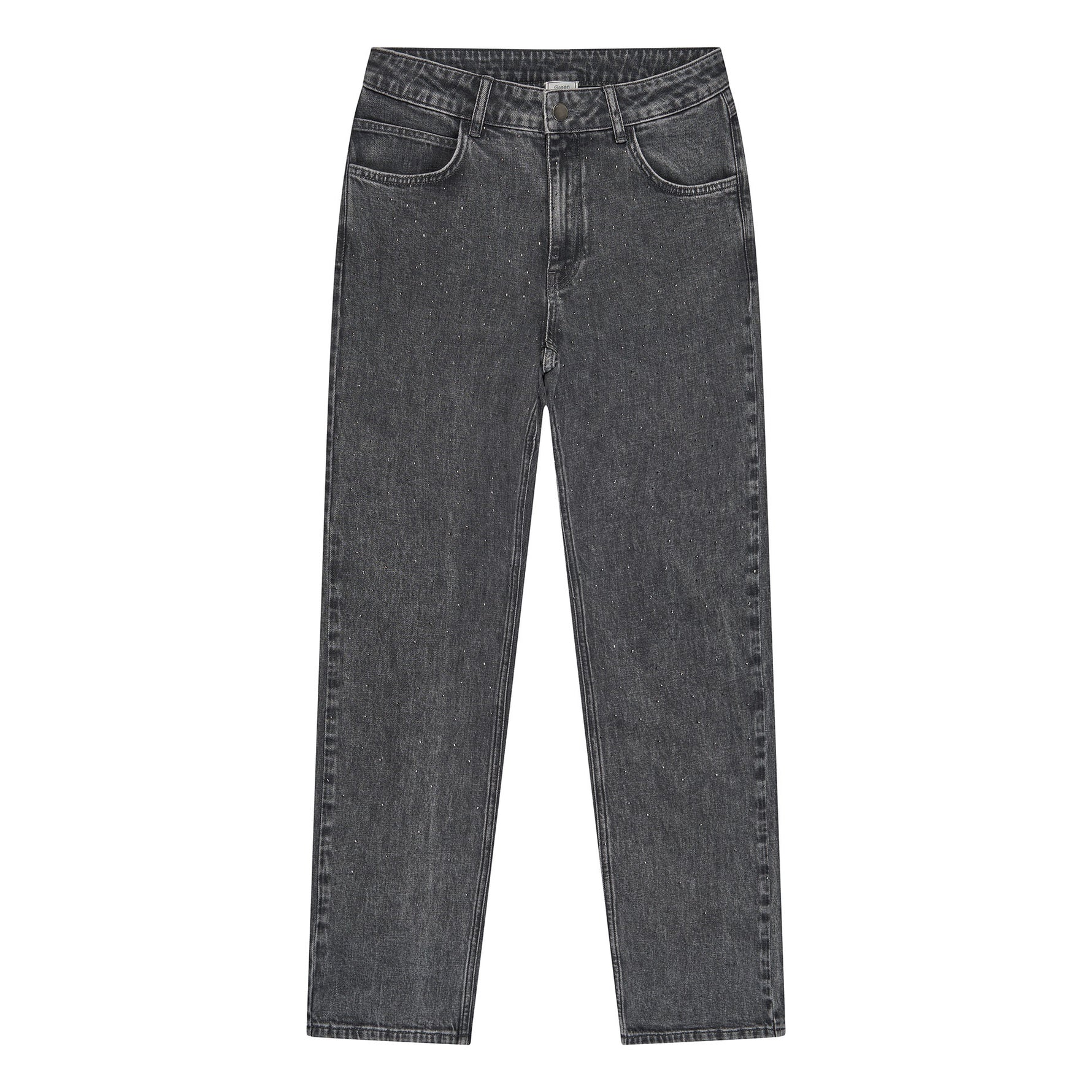 Een denim broek met een binnenbeenlengte van 76cm, een rechte maar losse pasvorm en afgewerkt met enkele strass-steentjes voor een subtiele glans.