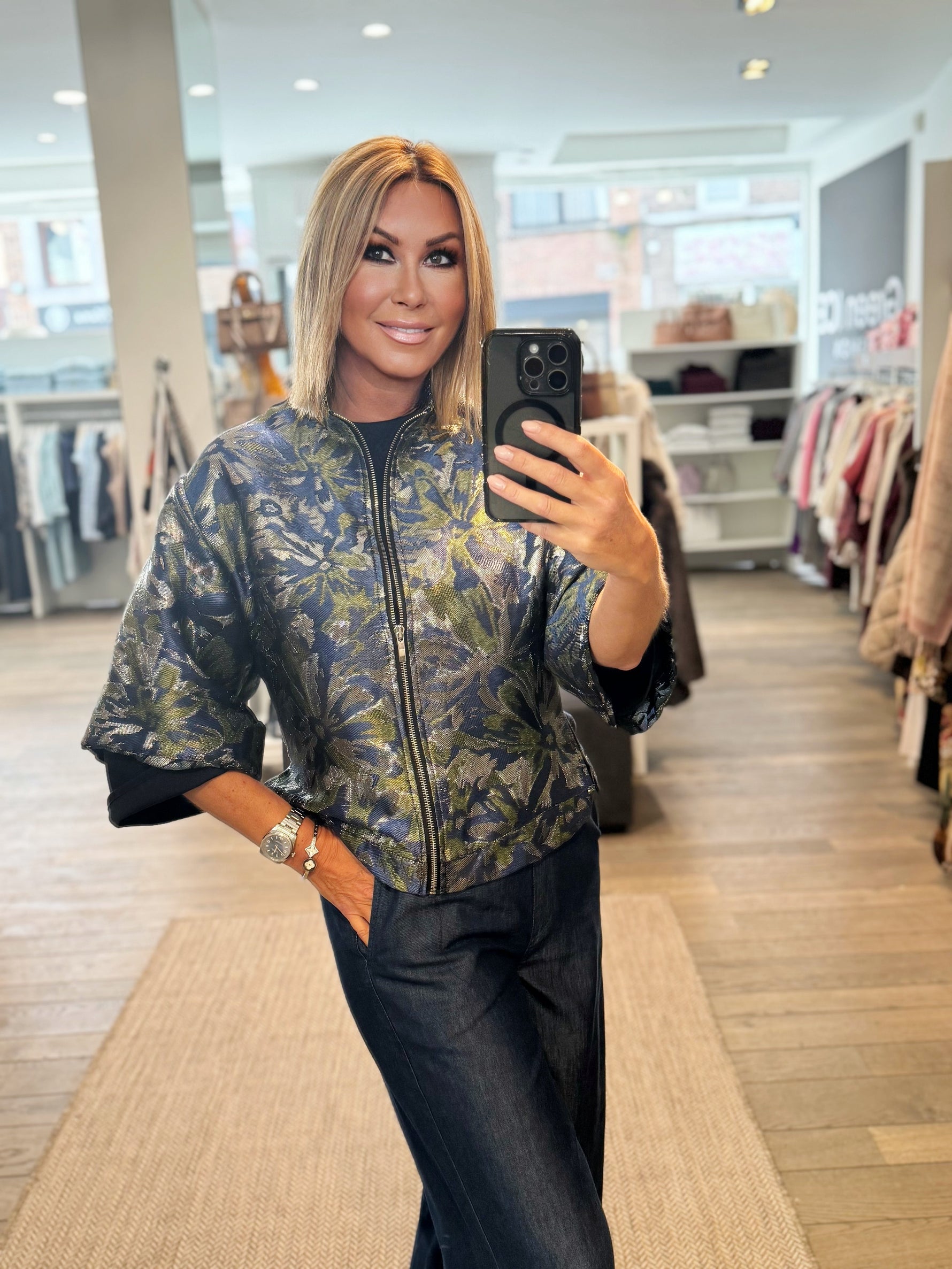 Een jacquard vest, voorzien van een 3/4de mouw en afgewerkt met een bloemen patroon