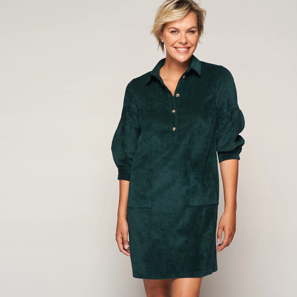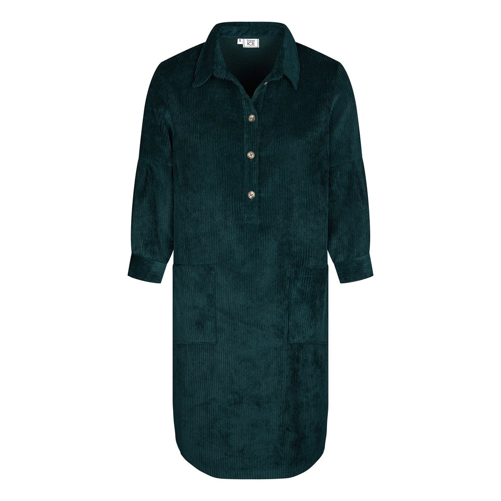 Een ribfluweel jurk met een totale lengte vanaf het schouder-nekpunt van 100cm en afgewerkt met een knopen sluiting aan de hals en 2 zakken op de voorzijde